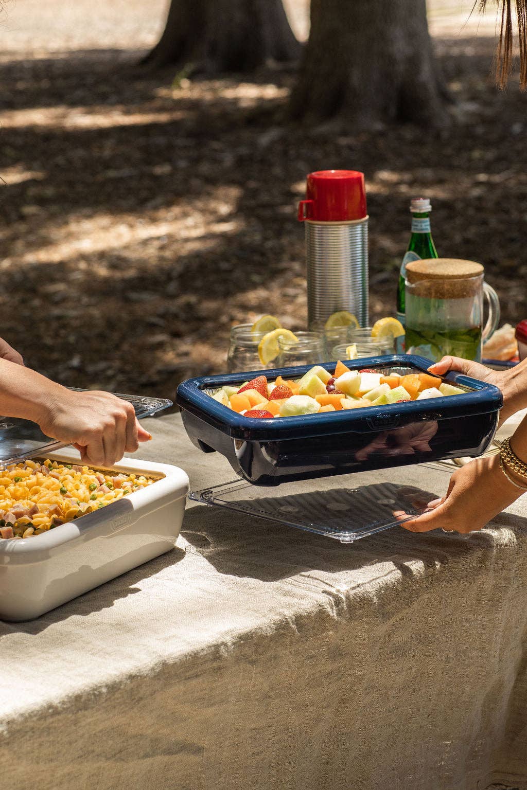 Use the clear lid as a trivet or keep it on to maintain food temperature and keep bugs out.