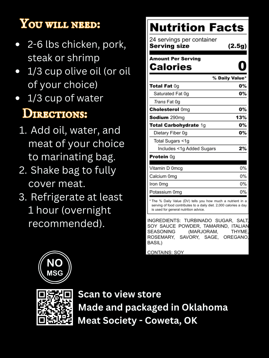 Our marinade kit includes 2 oz. of seasoning in a 2 gallon zip lock bag. Simply add oil and water with your meat and refrigerate overnight.