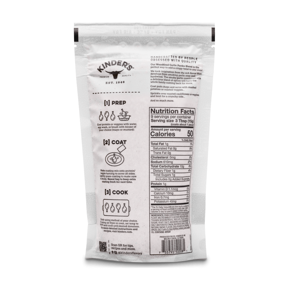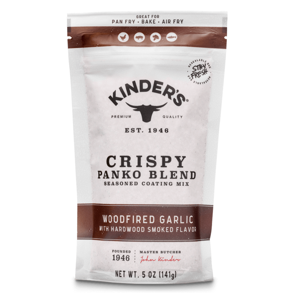 Our Woodfired Garlic Panko Blend is the perfect way to add a crispy twist to any meal. We took inspiration from the rich flavor that develops from smoking garlic over real hardwood. The smoky garlic combined with a delicious blend of spices will have the whole family coming back for more. Coat pork chops and serve with mashed potatoes or roasted veggies. Sprinkle over roasted cauliflower or veggies and broil for a crunchy side dish. And so much more.